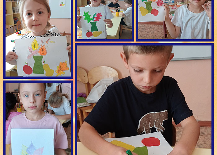 Ребята группы № 3 компенсирующей направленности «Светлячки» очень любят творить в нашей художественной мастерской. Тем более, что осень — щедрая для этого пора, а осенний натюрморт — это творение, которое отражает красоту и очарование осеннего сезона. Этот натюрморт захватывает взгляд своими яркими и насыщенными цветами осенних листьев и плодов, создавая атмосферу уюта и тепла, а сочетание в одной работе аппликации и рисования только усиливает этот эффект. Фото